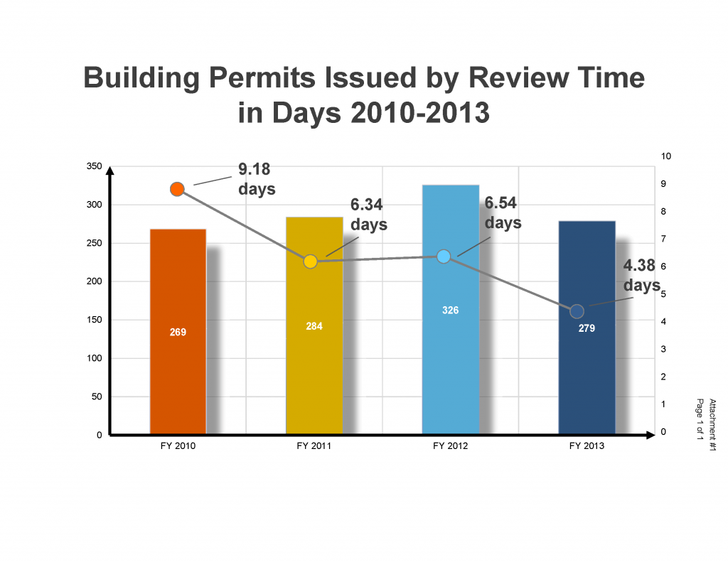 Ms. Jumonville reported that the average review time for such building permits has decreased from 9.18 days in Fiscal Year (FY) 2010 to 4.38 days in FY 2013. During that time, the number of building permits issued increased from 269 in FY 2010 to 326 in FY 2012, then declined somewhat to 279 in FY 2013.