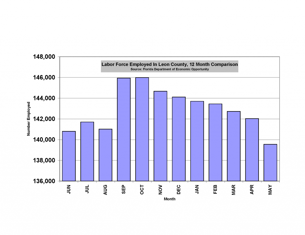 The latest employment data shows that the number of people employed in Leon County has declined for the 7th month in a row and has reached a 21-month low. Not since August 2013, has the number of people employed in Leon County been below 140,000. The May 2015 number stands at 139,550.