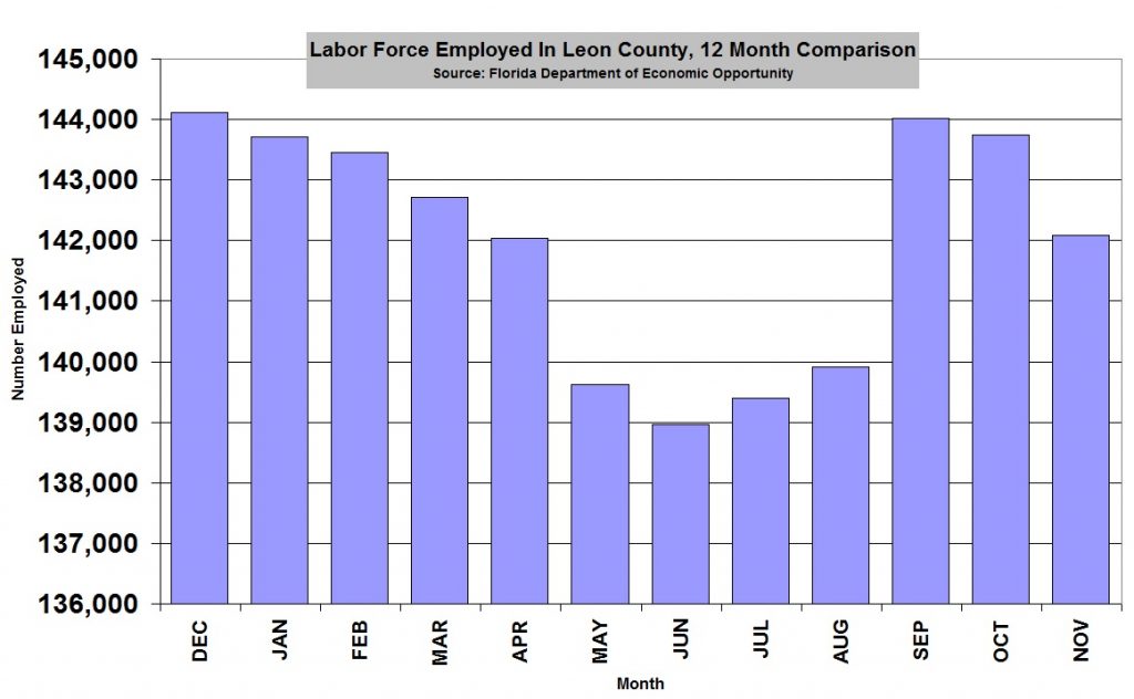 In January of this year, 151,842 made up the Leon county workforce. As of November, that number has decreased by approximately 3,000 to 148,761.