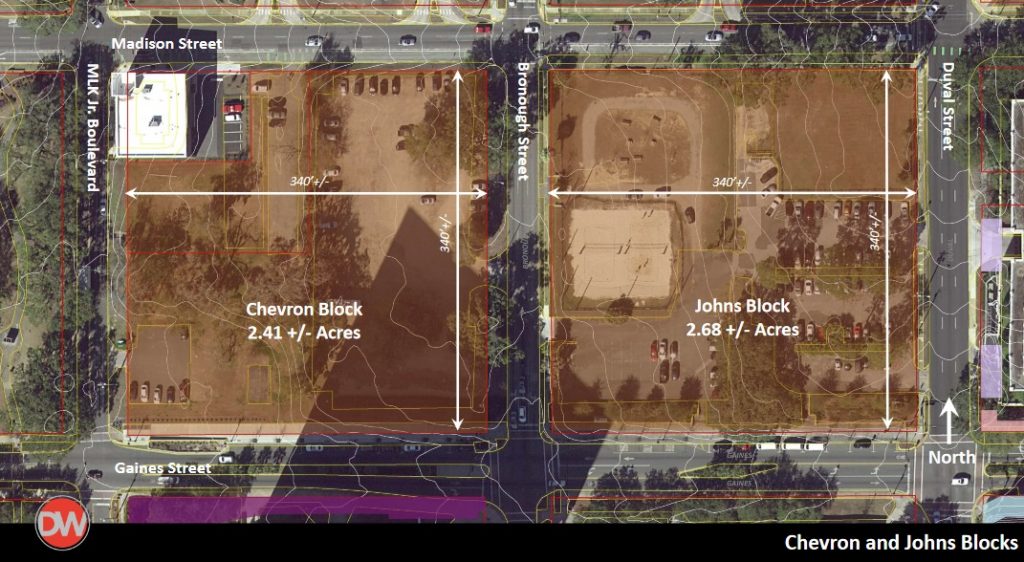 The two properties are designated as the Chevron Block (2.4 acres) and Johns Block (2.7 acres). The properties are bounded by W. Gaines Street, S. Martin Luther King, Jr. Boulevard, W. Madison Street and S. Duval Street. The blocks are bisected by S. Bronough Street.