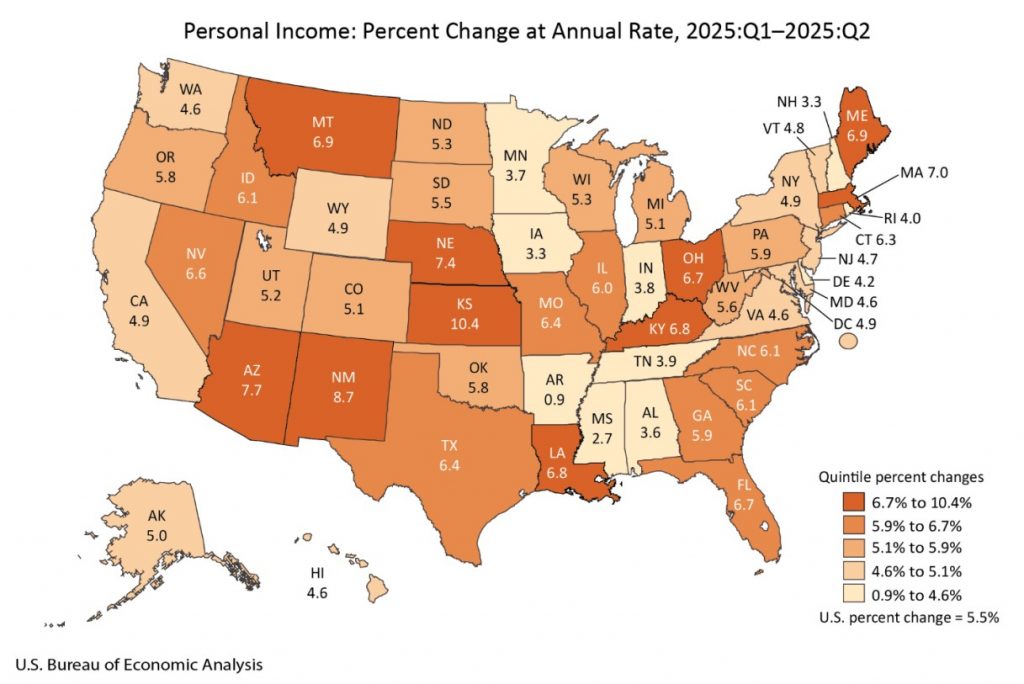 The U.S. Bureau of Economic Analysis recently released new quarterly statistics on gross domestic product and personal income for all 50 states and the District of Columbia for the second quarter of 2025 (April, May, and June).