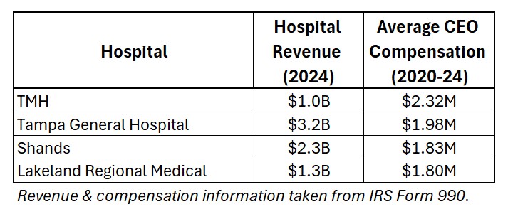 For comparison purposes, the 2024 annual revenue for the hospitals in the comparison were TMH – $1.0 billion, Shands $2.3 billion, Tampa General Hospital – $3.1 billion, and Lakeland Regional Medical Center $1.3 billion.