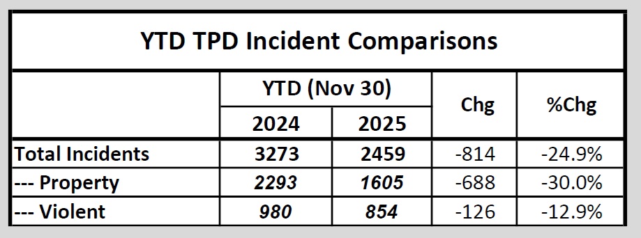 The incident data -tabulated by TR – show that property crime incidents are down 30.0% and violent crime incidents are down 12.8% during the 11-month period.