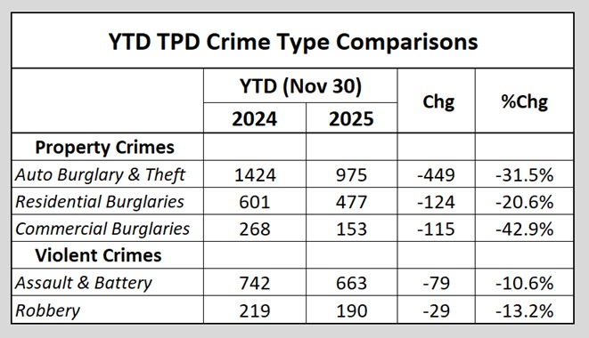 Through November, crime incident data published daily by the Tallahassee Police Department shows that total crime incidents have declined by 24.9% when compared to incident data from January thru November in 2024. The drop was driven by a 42.9% decline in commercial burglaries and a 31.5% decline auto related crime incidents.
