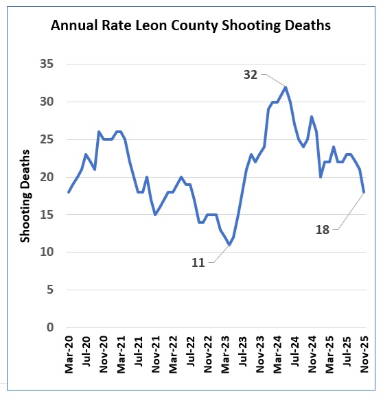 During this 11-month period, there have been 18 fatal shootings in 2025, compared to 26 fatal shooting deaths in 2024. The annual rate of shooting deaths has been trending down since May 2024 when the number of deaths reached 32.