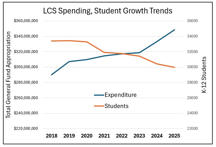 The chart below shows that over the last seven years Leon County School spending has increased approximately $41.7 million, a 14.4% increase, while the number of students has declined from 33,391 to 29,990.