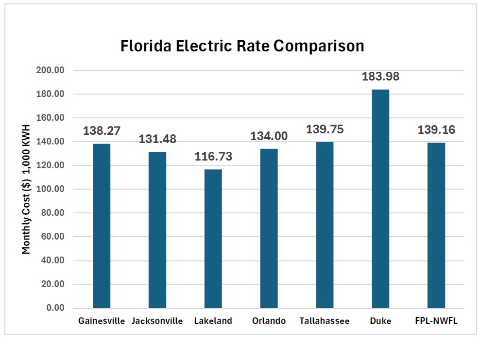 The most recent information provided by the Florida Municipal Electric Association for January 2026, shows the monthly costs of a 1,000 kwh ranges from $116.73 in Lakeland to $183.98 for Duke, which serves customers throughout Florida, including customers in Wakulla and Bay counties. The cost for Tallahassee customers in January was $139.75.
