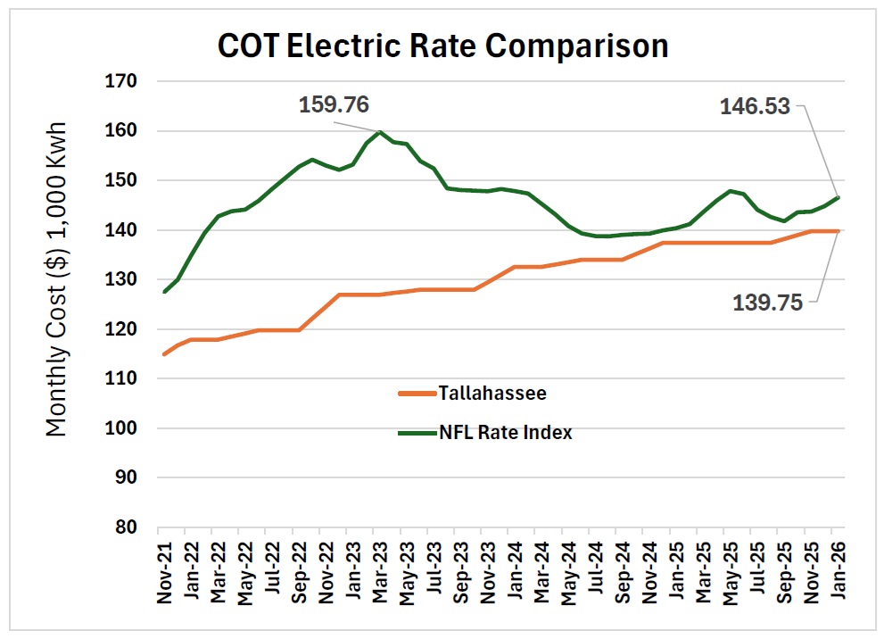 A comparison of monthly electricity costs over a four-year period between the City of Tallahassee and other Florida cities shows that Tallahassee residential electric utility customers have enjoyed lower electric rates, however, the advantage has recently narrowed. Details.