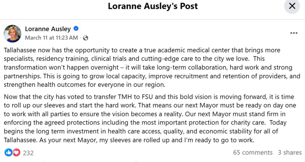 After the 3-2 vote to transfer city-owned hospital assets to FSU, Ausley posted a statement on Facebook urging the community take advantage of the “opportunity.”