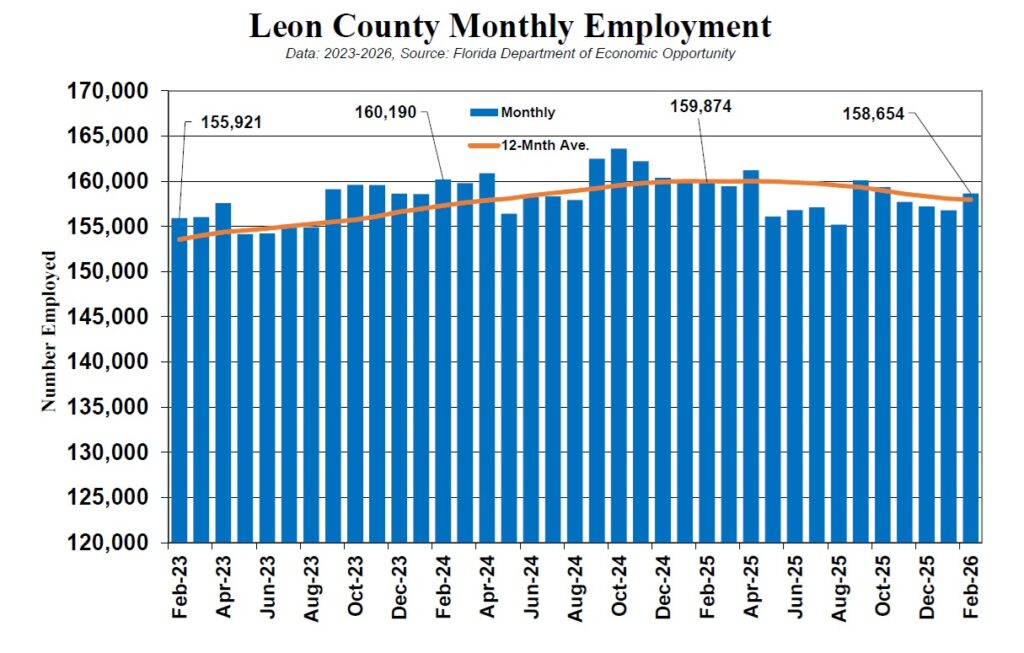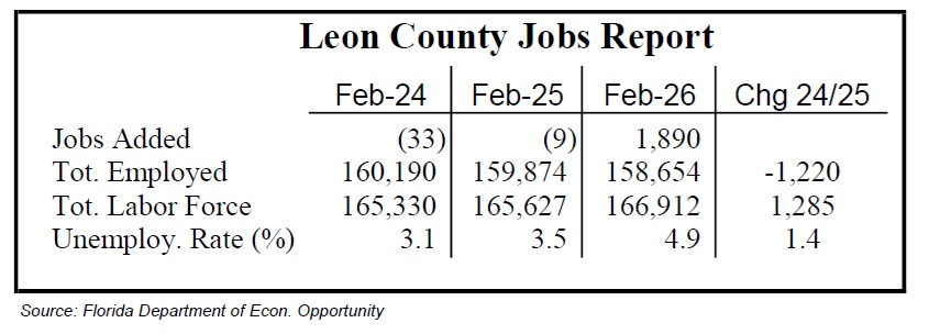 The Leon County Jobs Report, provided below, shows the number of people working in February 2026 was 1,220 less than in February 2025. The February labor force – those looking for jobs – came in at 166,912 which was 1,285 more than reported one year ago.