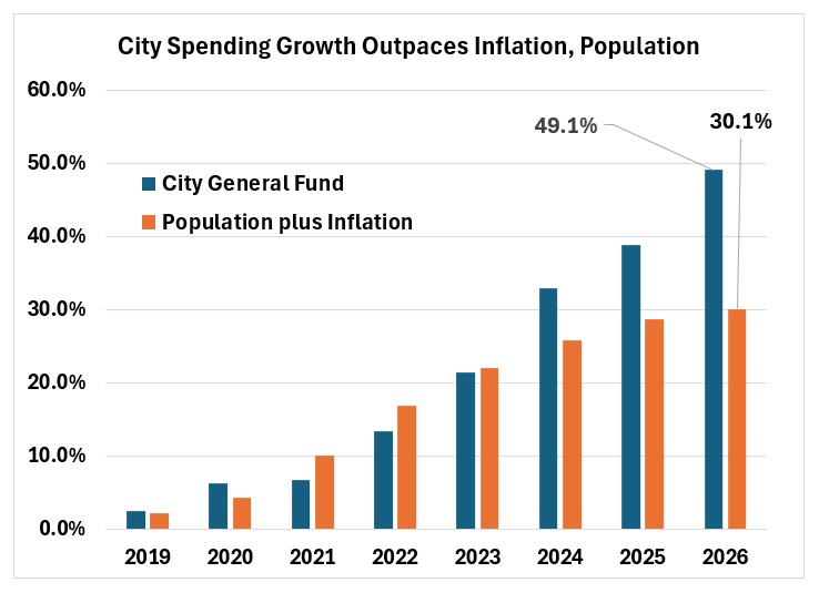 The graph below shows that general fund spending growth followed population and inflation growth from 2019 through 2023. However, from 2024 to 2026 spending accelerated relative to population growth and inflation rates.