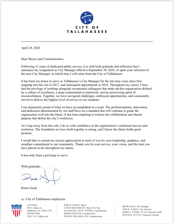 In a move that is sure to have electoral implications, Tallahassee Reports has learned that Tallahassee City Manager Reese Goad has informed the city commission that he plans to resign. In a letter (included below) addressed to the mayor and city commissioners, Goad announced his resignation “effective September 30, 2026, or upon your selection of the next City Manager, at which time I will retire from the City of Tallahassee.”